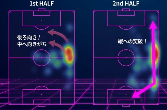 後半には、クロスを上げられる場面であえて中へ預け、落としたボールをシュートに持ち込む形で3〜4点は取れていてもおかしくない決定機を創出していました。